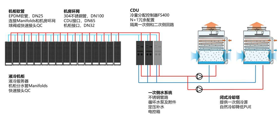 數(shù)據(jù)中心液冷解決方案,由“室外一次側(cè)液冷循環(huán)系統(tǒng)(以冷卻塔為主)+機(jī)房?jī)?nèi)二次側(cè)液冷循環(huán)系統(tǒng)(CDU為主)+液冷服務(wù)器”構(gòu)建。系統(tǒng)組成如下圖所示: