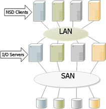 GPFS采用了水平結(jié)構(gòu)的設(shè)計,支持SAN組織形式或NSD組織形式(或兩者的混合),在架構(gòu)上每一層都可以得到擴展,避免了互相的牽連性以及性能的制約性。