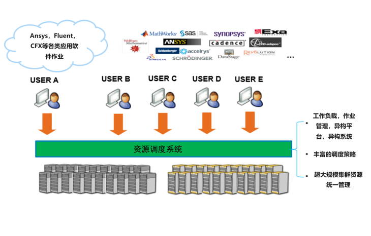 支持異構(gòu)的、多操作系統(tǒng),多集群擴展,多集群負載調(diào)度,多集群許可證調(diào)度,多集群資源管理,作業(yè)管理,作業(yè)控制,作業(yè)資源使用限制,并行作業(yè)運行資源使用統(tǒng)計,各種并行作業(yè),海量作業(yè)提交和調(diào)度,并行作業(yè)控制,并行作業(yè)容錯,高級預(yù)約功能、回填、搶占,絕對優(yōu)先級,獨占等多種調(diào)度策略,基于GPU的調(diào)度,具備多種MPI實現(xiàn)方式,包括MPICH,OPEN MPI,INTEL MPI,PE,PLATFORM MPI等。